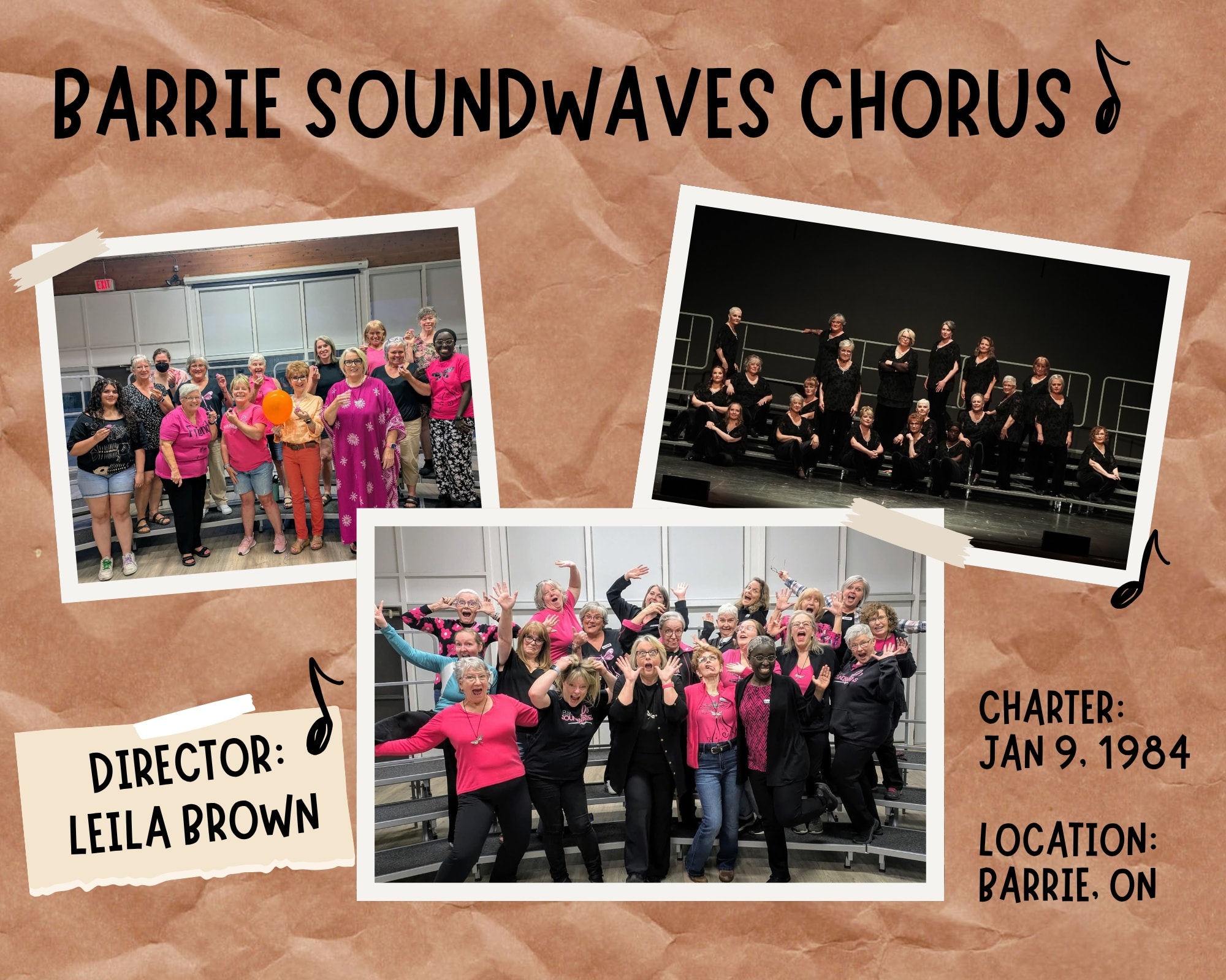 Welcome to Barrie Soundwaves! We're a vibrant community of women who share a passion for singing, friendship, and personal growth through music. Our chorus is built on laughter, learning, and the joy of performing together.